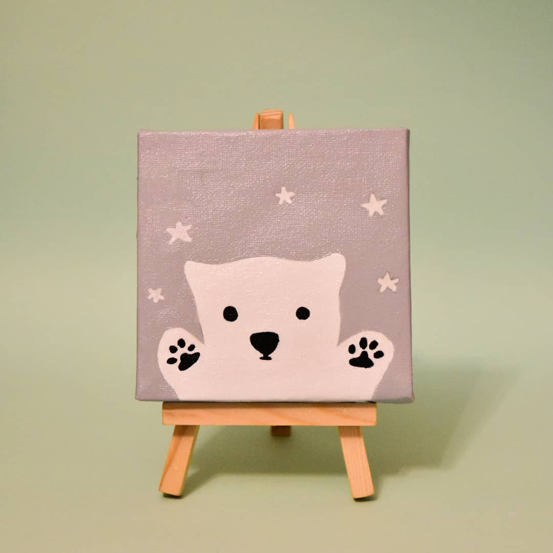 A handpainted canvas with a mini wooden easel.