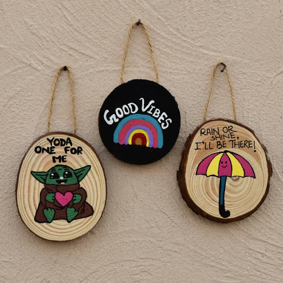 A handpainted mini wood slice hanging, approximately 2.5 inches in size.